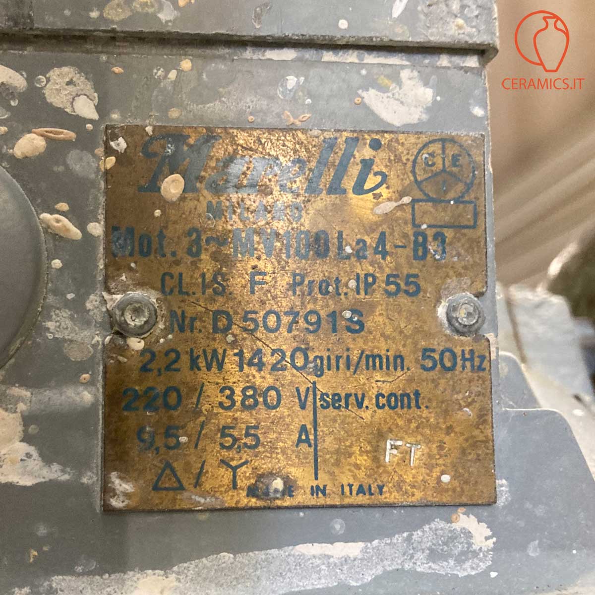 - DESCRIZIONE: agitatore ottagonale veloce usato per barbottina, serbatoio in cemento, capacità 300 kg di argilla, motore a 380 volts, kw 2,2 a 1420 giri. Elica è in perfetto stato, dotato di pulsante di stop. Misure di ingombo con il bancale cm 100 x 100 altezza cm 160.