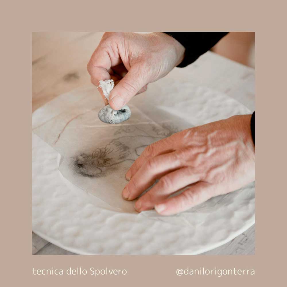 La mattina è incentrata sullo studio e la riproduzione: i partecipanti selezioneranno uno degli antichi spolveri della San Marco e basandosi su foto e piatti d'epoca si concentreranno sulla tecnica di applicazione e tamponatura dello spolvero per ricreare fedelmente il decoro storico.